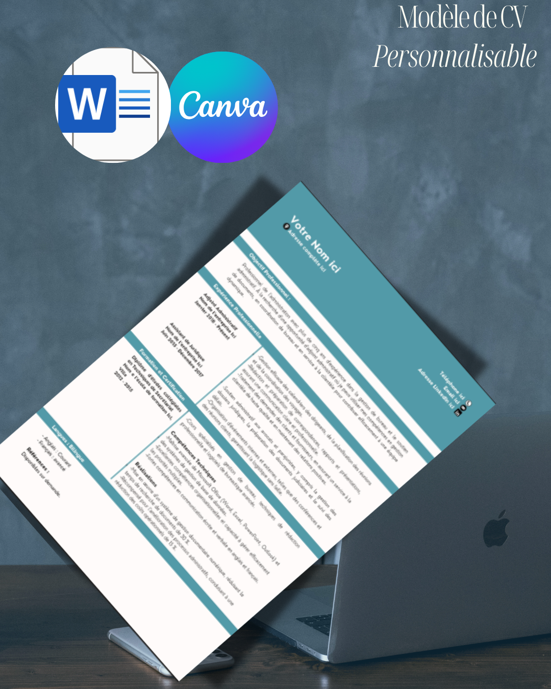 Donnez une touche moderne et professionnelle à votre candidature avec notre modèle de CV personnalisable turquoise. Élegant et distinctif, ce modèle offre une mise en page claire et structurée, parfaite pour valoriser vos compétences, expériences et réalisations. La couleur turquoise apporte fraîcheur et dynamisme, captant l’attention des recruteurs sans être trop intrusive.